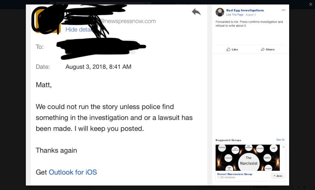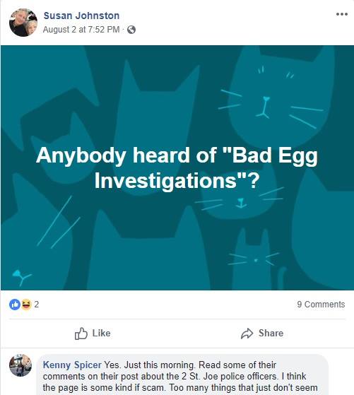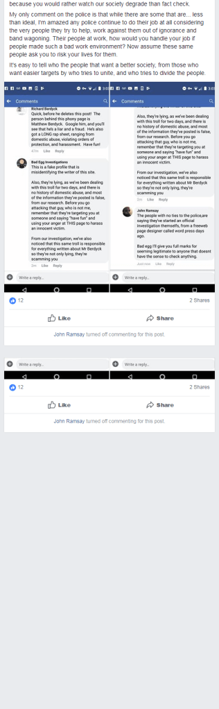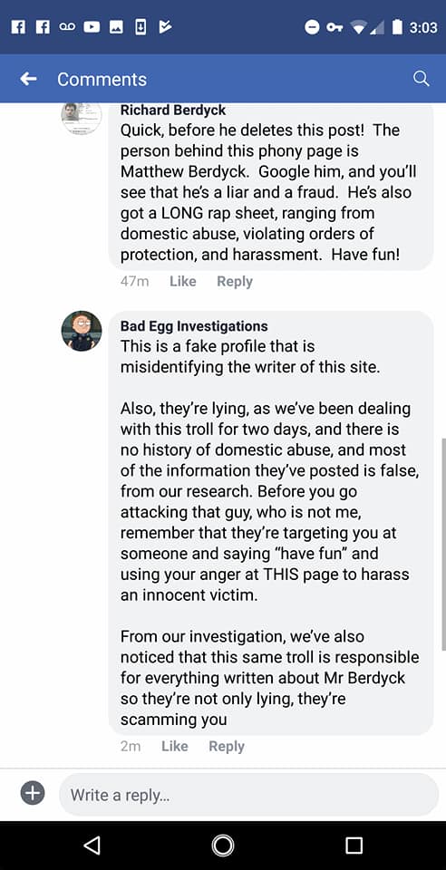 Matthew Berdyck denies running the Bad Egg Investigations Facebook page and website. They used images that were from his private iPhone that were not made public and they agreed with him 100% in every way.