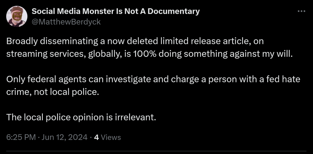If the documentary is outing Matthew Berdyck’s LGBTQ+ status…. why did he write articles back in 2018-2020 before the documentary was even an idea and publish them on his “newspaper” and social media? Production on the film did not start until Feb 2019 and did not complete until 2021/2023 on the documentary Social Media Monster.