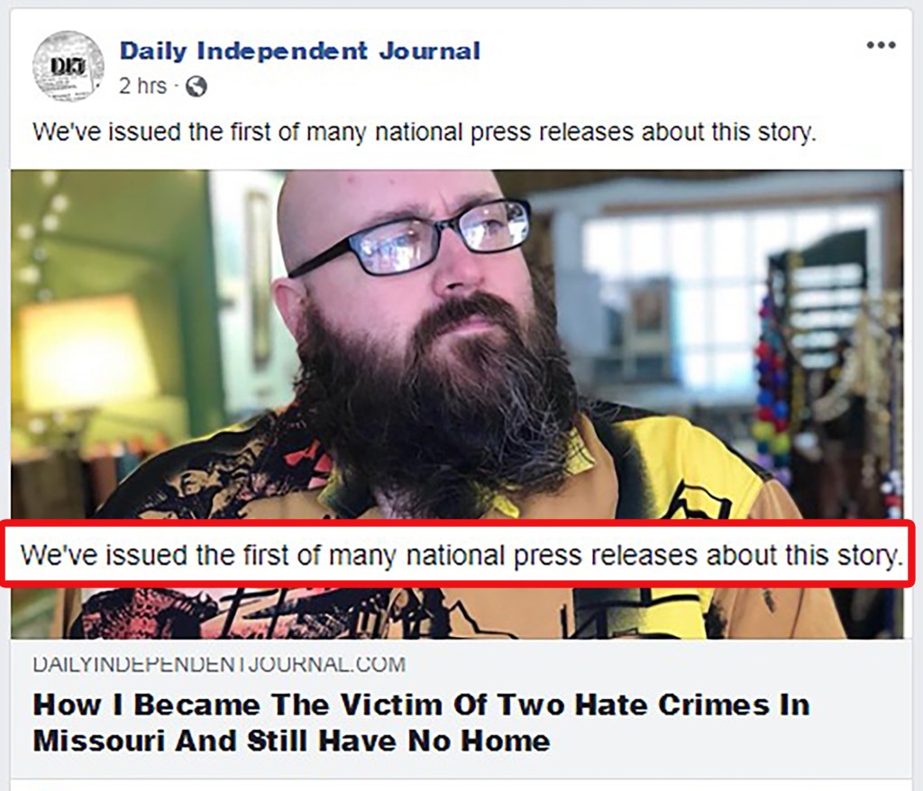 See the archive of the same article, also written by Matthew A. Berdyck himself, updated to state he “still” had no home in 2020 https://web.archive.org/web/20200923023502/https://dailyindependentjournal.com/how-i-became-the-victim-of-two-hate-crime-and-still-have-no-home