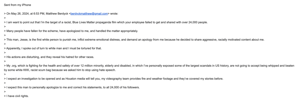 “I wasn’t planning to review Social Media Monster. Honestly, I probably wasn’t even going to watch it. But after sharing the trailer on our social accounts, I was thrust into a world I didn’t want to be in. Matthew, the Social Media Monster himself, immediately proved Peter John Ross correct. A brief exchange was all it took before Matthew contacted my employer with the most ludicrous claims. While I don’t want to be in my very own episode of Baby Reindeer, this guy is a complete loser, and I’m determined to shine a light on the film, the issues it raises, and the pathetic piece of shit that Matt truly is.”